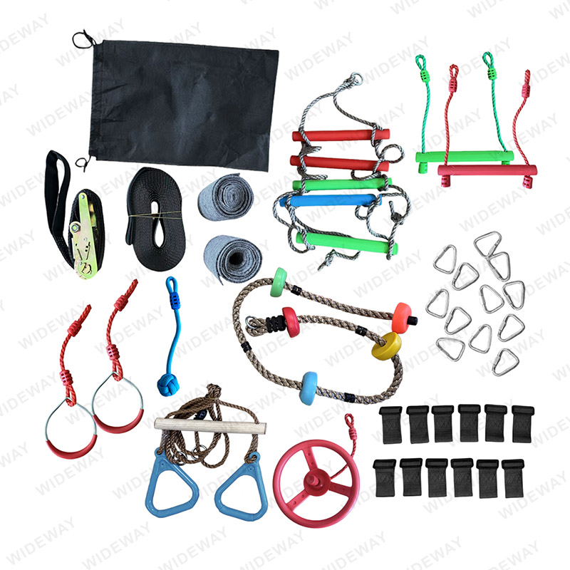 2 kpl trapetsipalkit, 1 kpl trapetsitangon kanssa kolmion voimistelurenkaat, 2kpl voimistelurenkaat, köysitikkaat, apinan nyrkki ja pyörivä ninjapyörä, lapset voivat sekoittaa ja sovittaa kurssikokouksensa mukauttaakseen jokaista haastetta. Tämä Slackline-pakkaus on valmistettu korkealaatuisesta polyesterihihnasta, joka on täydellinen takapihan pelaamiseen, puistoretkiin ja ulkoseikkailuihin.
